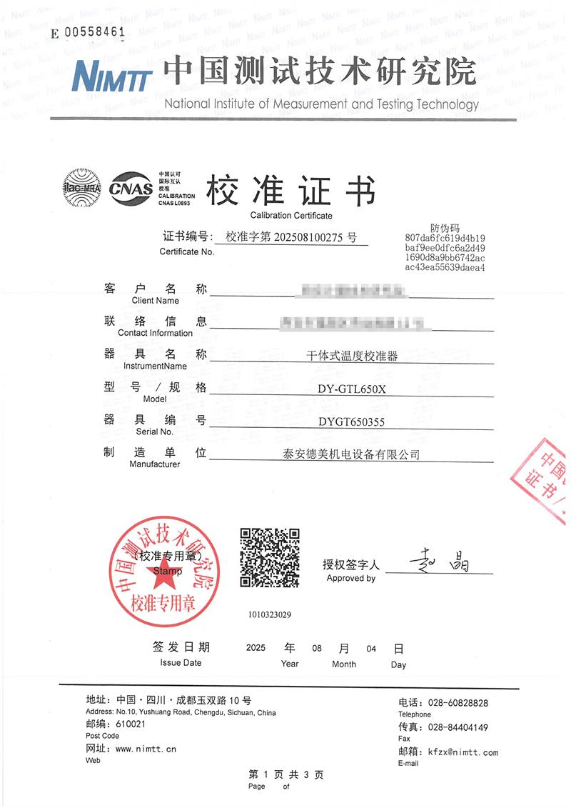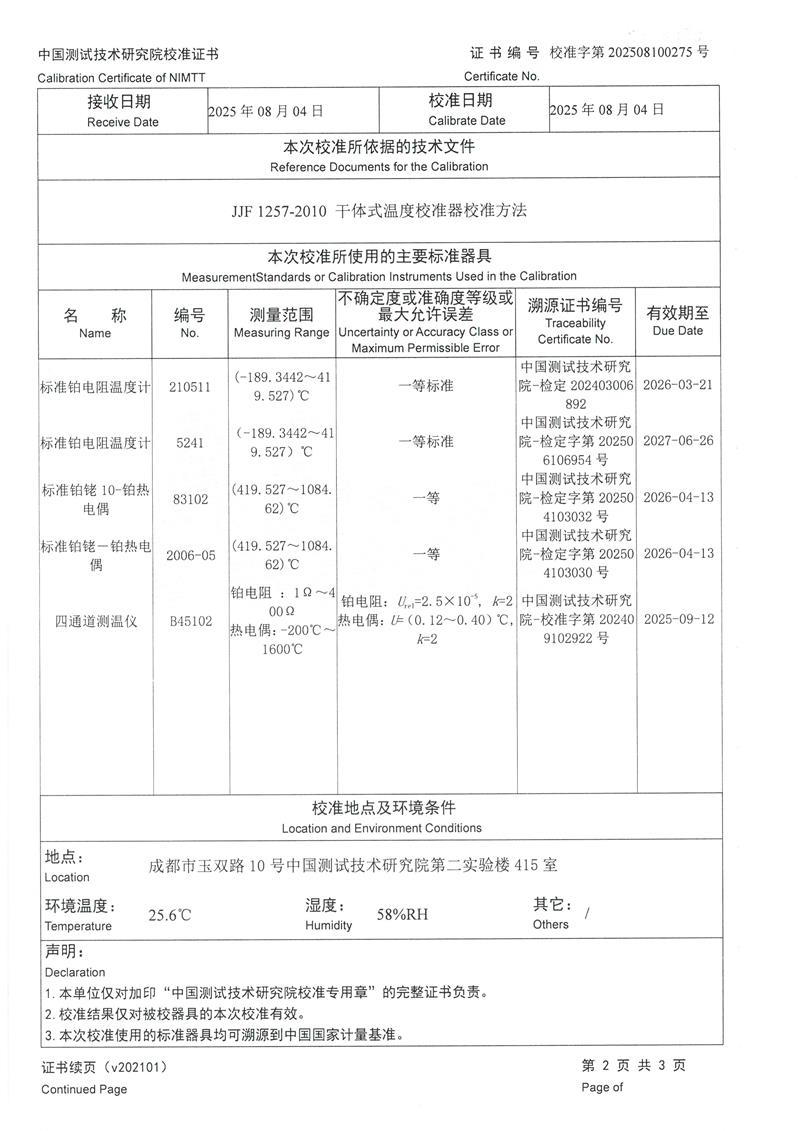 干體式溫度校準(zhǔn)器(40~650℃)校準(zhǔn)證書 2025-8-6 本文被閱讀 1752 次