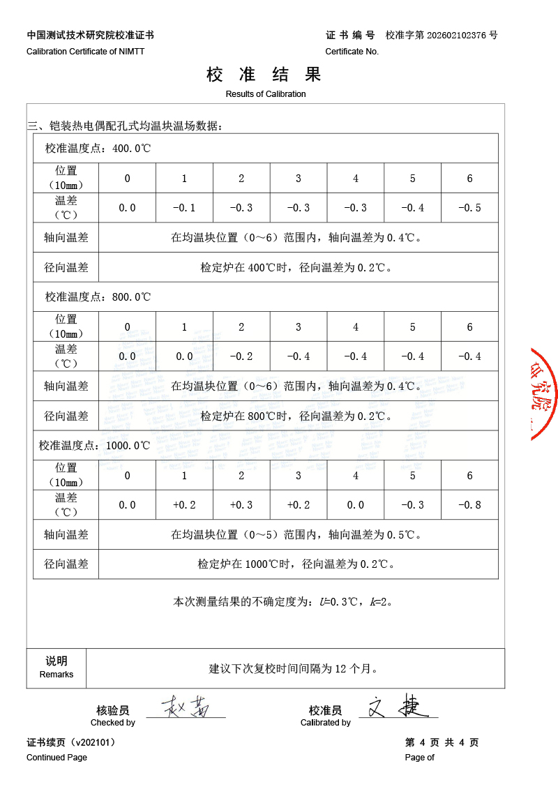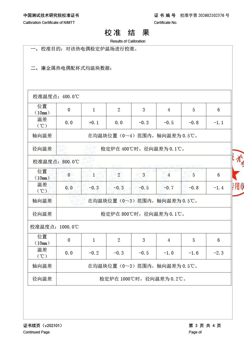 三區(qū)廉金屬熱電偶檢定爐-校準(zhǔn)證書