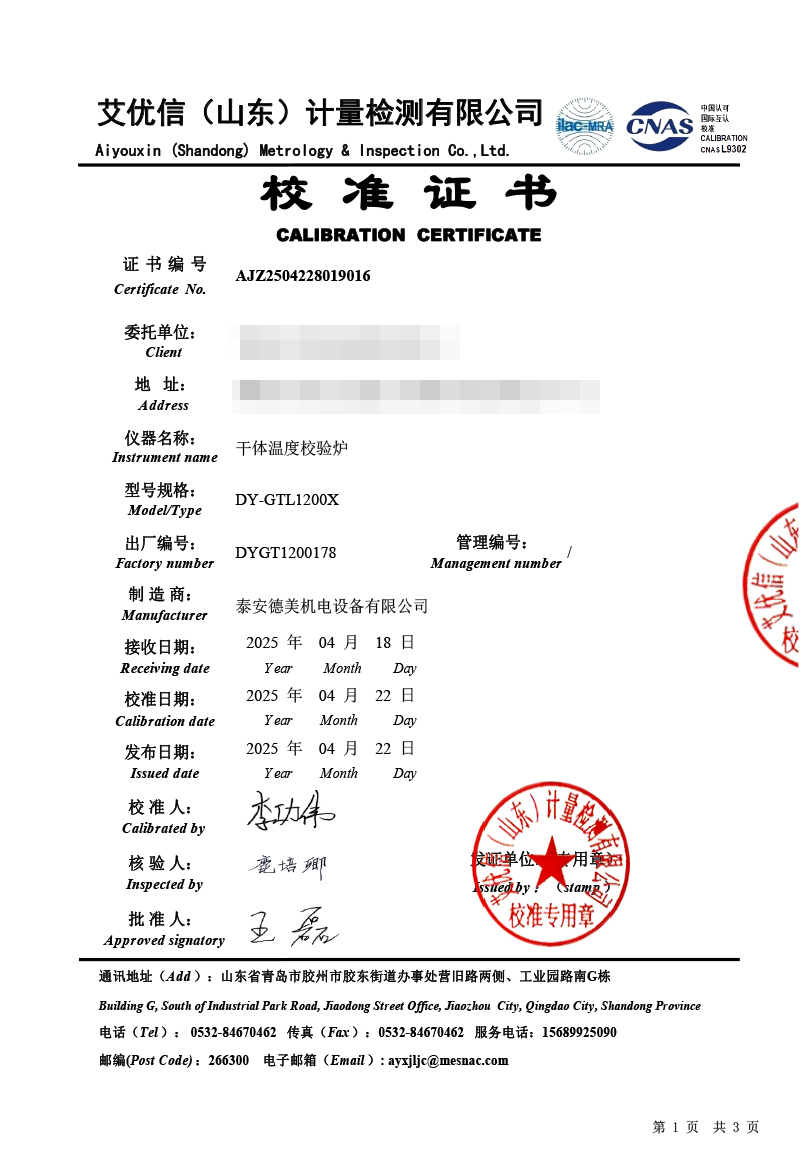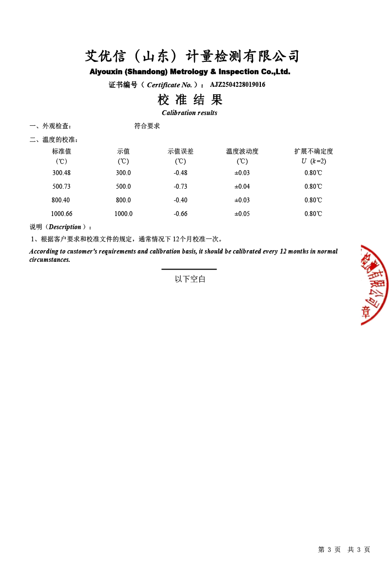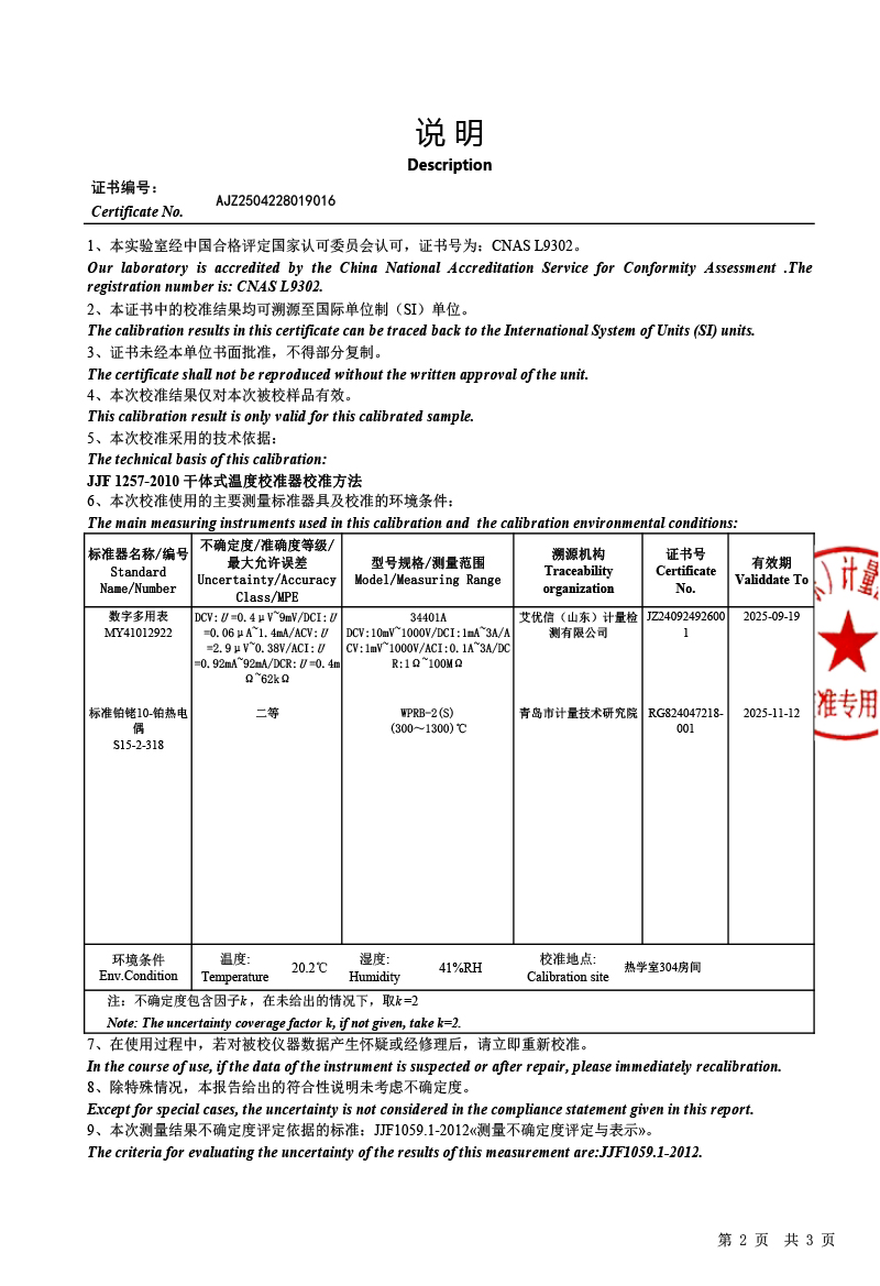| 上一條:高精度數(shù)字溫度計(-50-450℃)校準證書 | 下一條:超低溫面源黑體爐(-40-80℃)校準證書 |