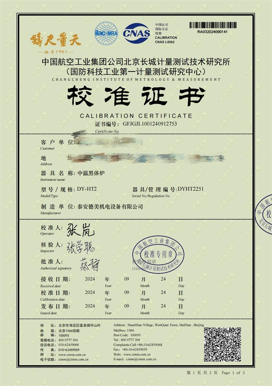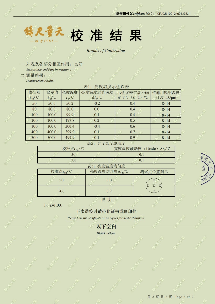 中溫黑體爐(50-500℃)校準證書 2024-10-17 本文被閱讀 5273 次