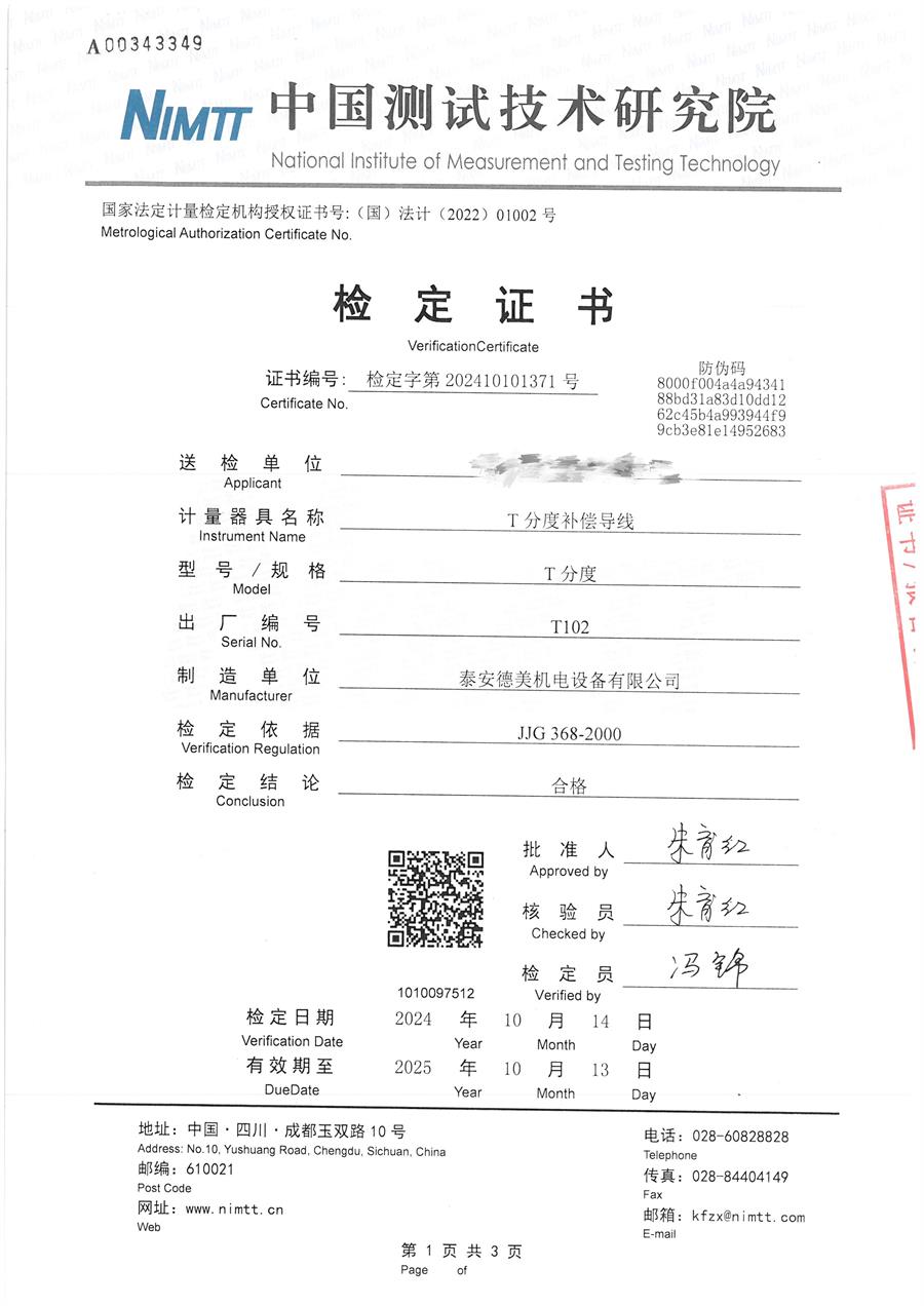 T分度補償導線檢定證書 2024-10-17 本文被閱讀 6088 次