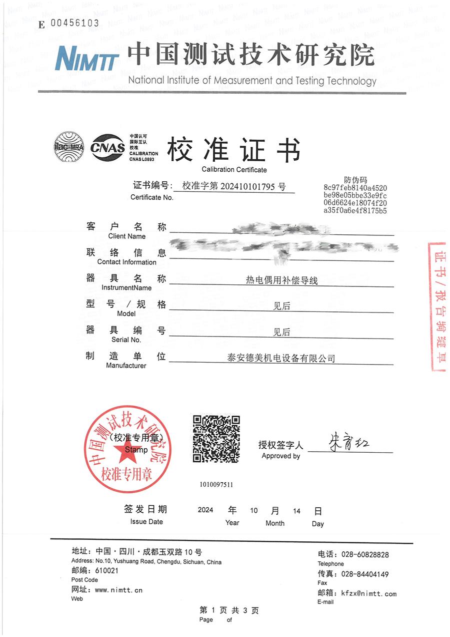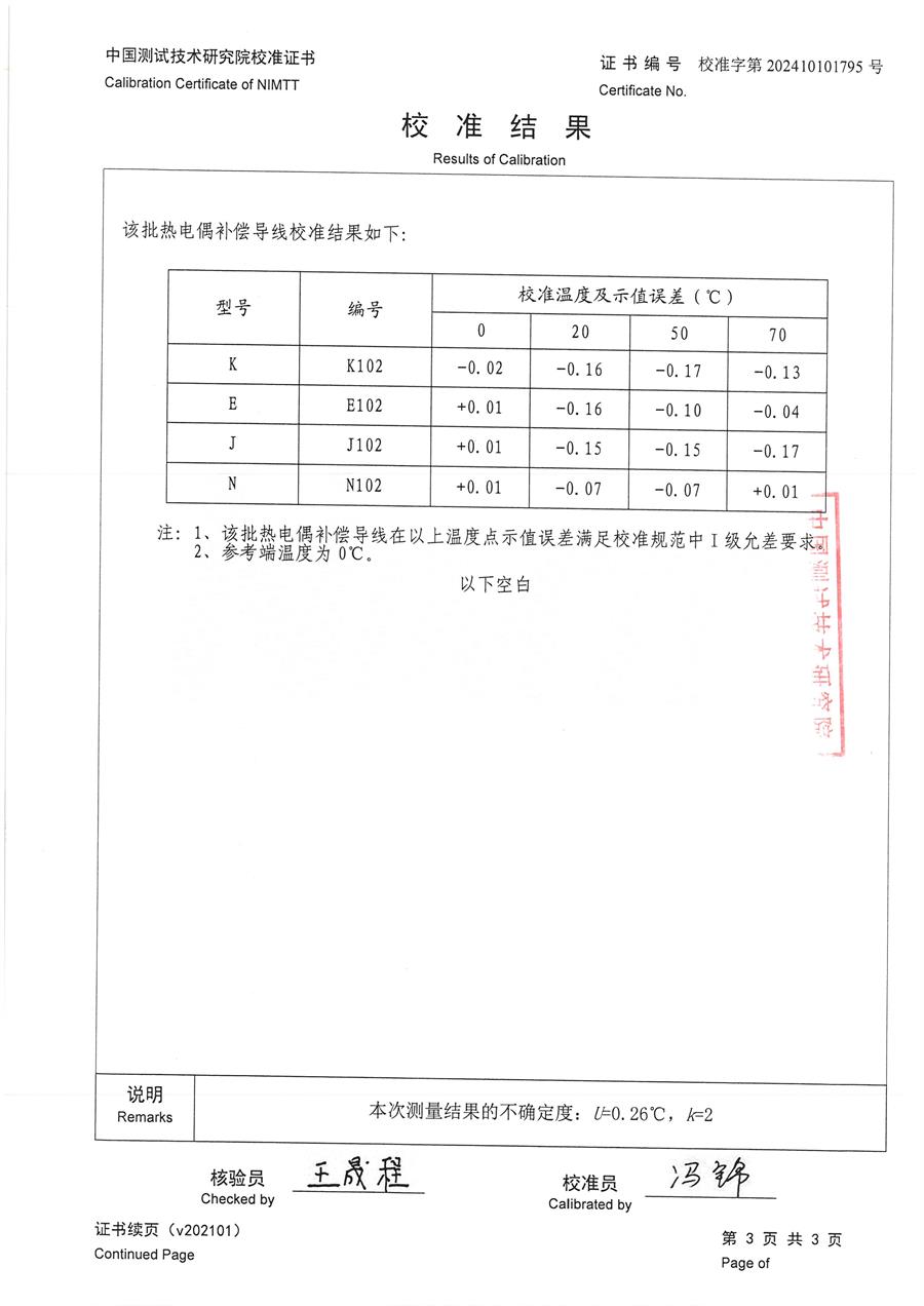 熱電偶用補(bǔ)償導(dǎo)線KEJN校準(zhǔn)證書