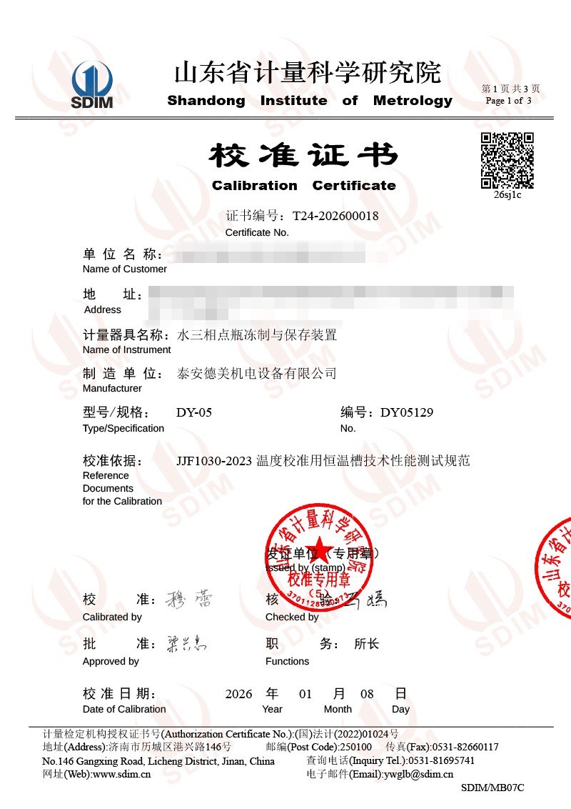 水三相點瓶凍制與保存裝置校準證書 2026-1-13 本文被閱讀 1093 次
