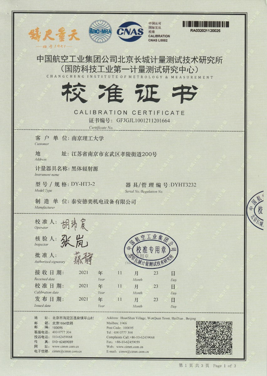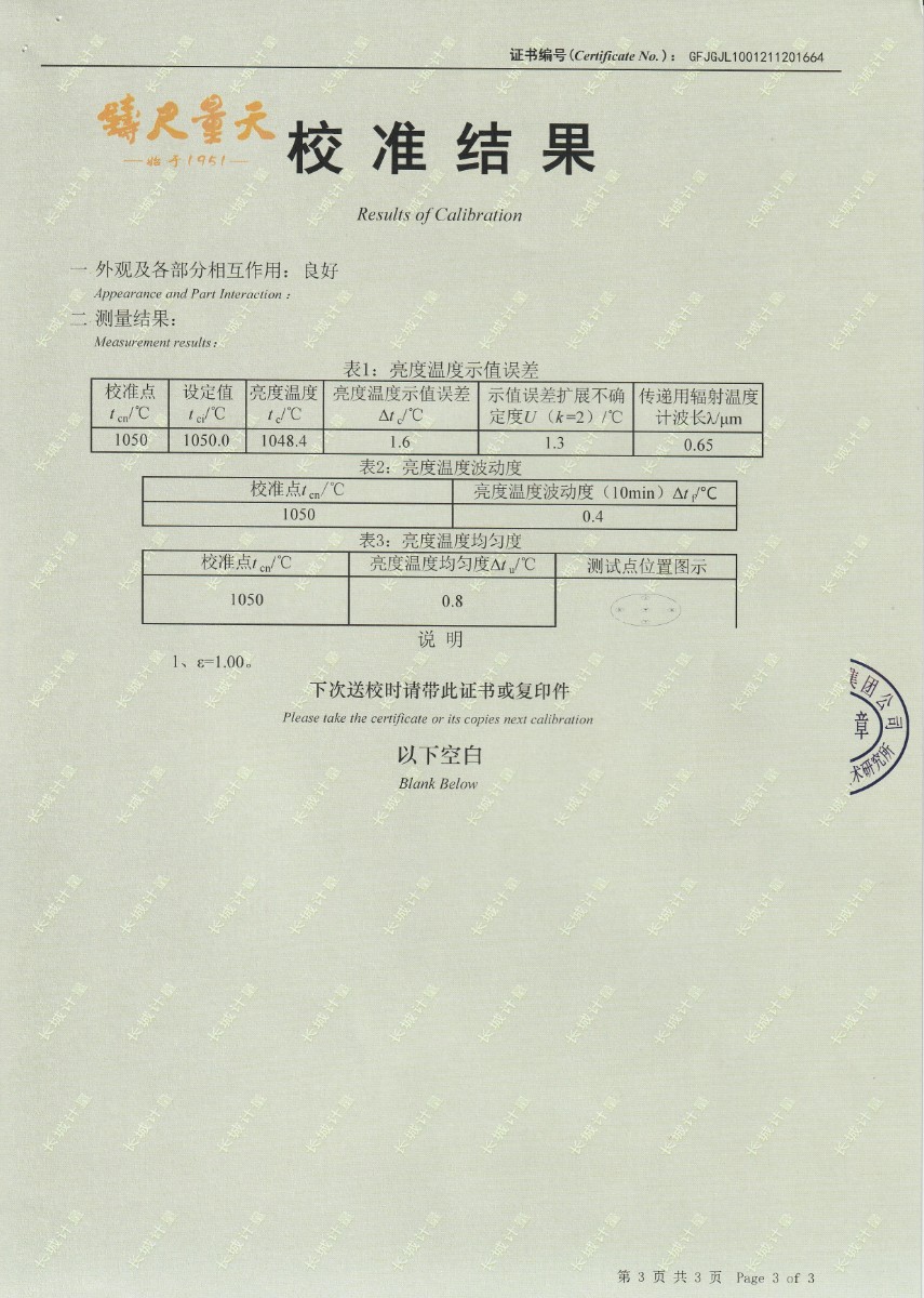 | 上一條:南京理工大學(xué)-黑體輻射源校準(zhǔn)證書600℃ | 下一條:便攜式干體爐(-30-150℃)校準(zhǔn)證書 |