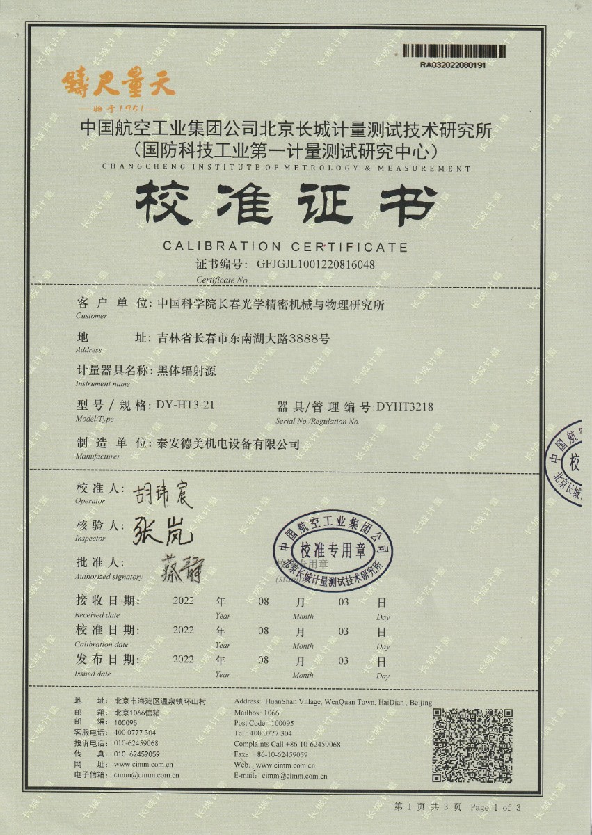上一條:中國科學(xué)院長春光學(xué)精密機(jī)械與物理研究所-黑體爐DY-HT3-11 | 下一條:便攜式干體爐(-30-150℃)校準(zhǔn)證書 |