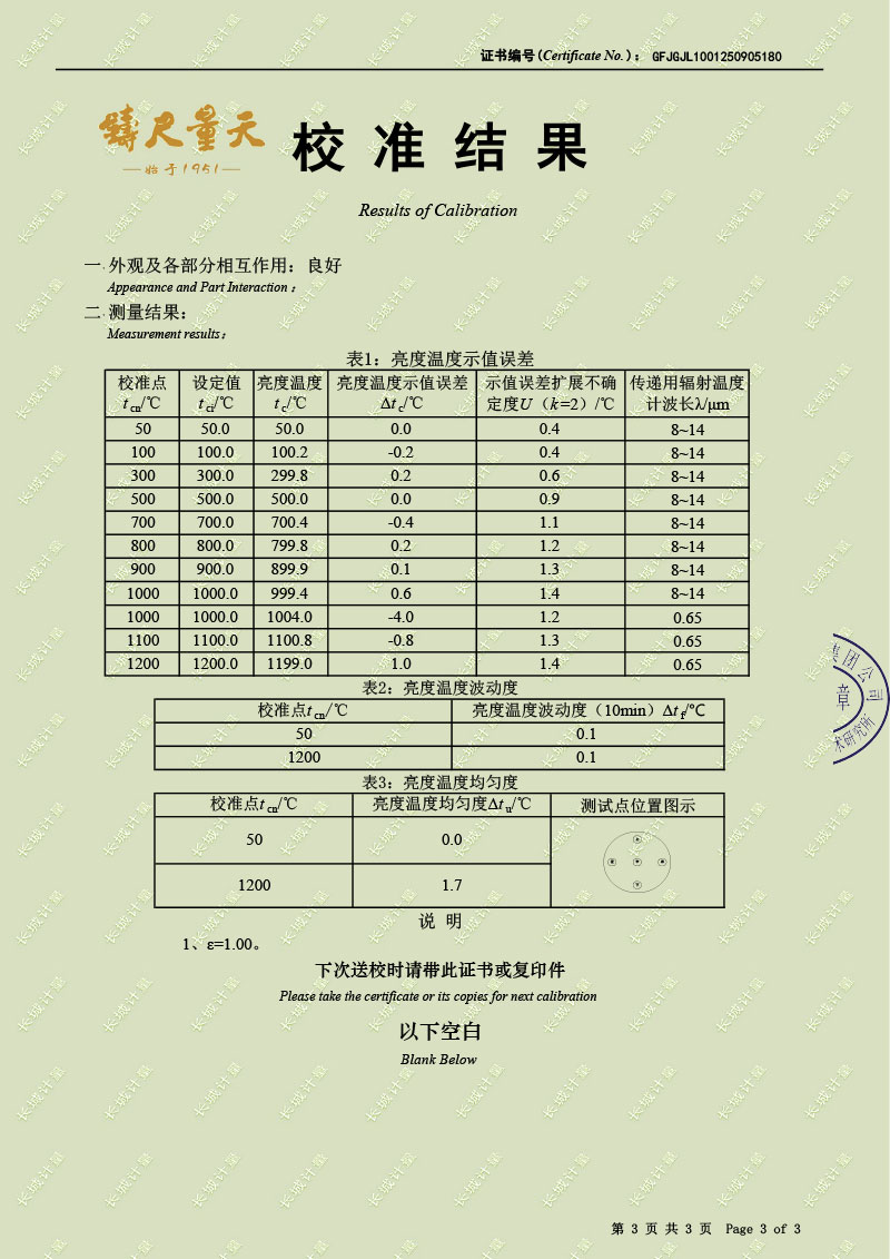 黑體輻射源(50-1200℃)校準證書 2025-9-22 本文被閱讀 666 次