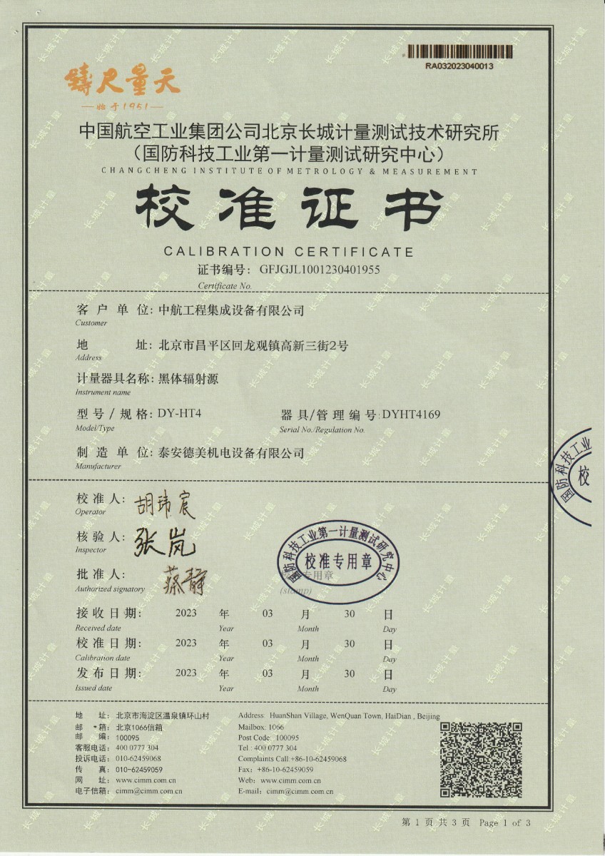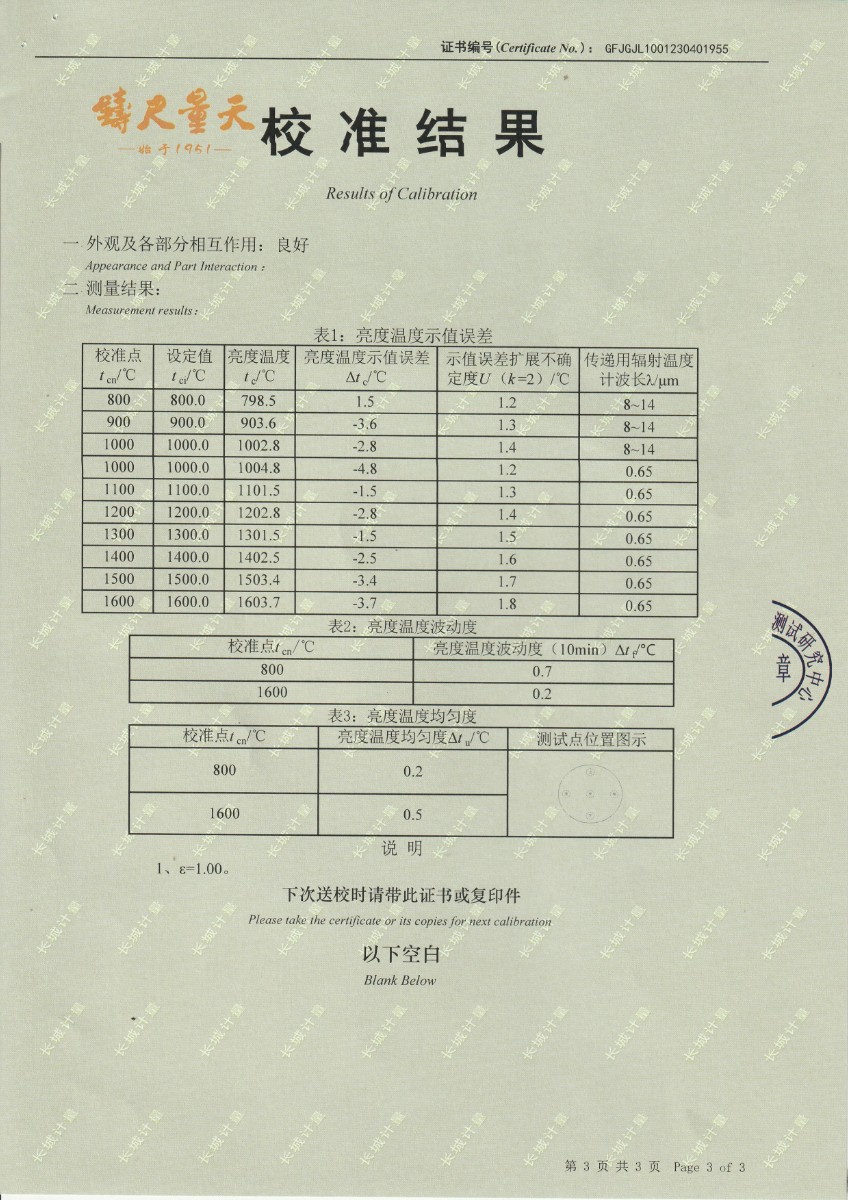 | 上一條:浙江弘志計量測試有限公司 黑體輻射源 校準(zhǔn)證書 | 下一條:便攜式干體爐(-30-150℃)校準(zhǔn)證書 |