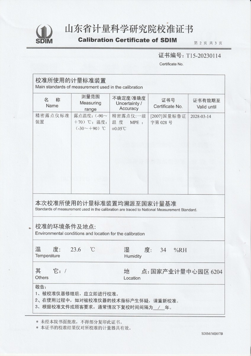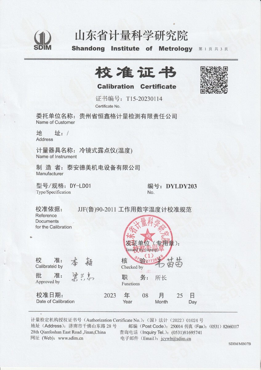 貴州省恒鑫格計量檢測有限責任公司-冷鏡式露點儀校準證書 2023-9-4 本文被閱讀 10450 次