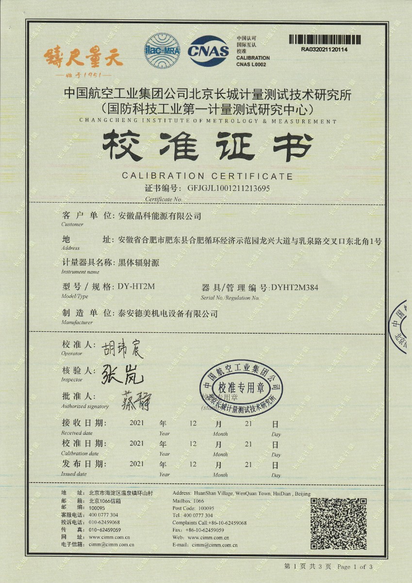 安徽晶科能源有限公司-黑體輻射源 2022-1-4 本文被閱讀 14695 次