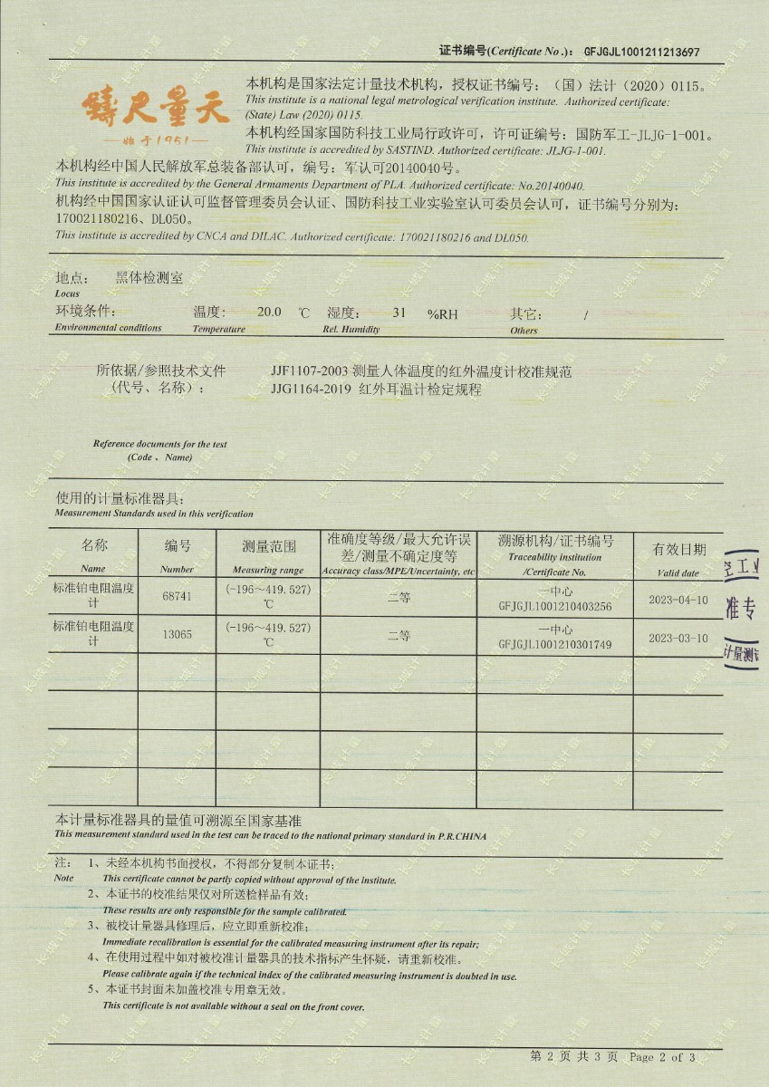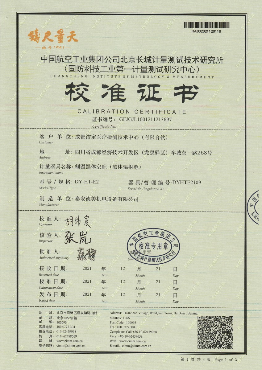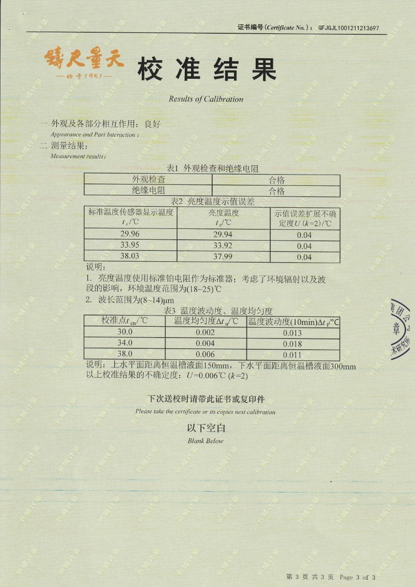 | 上一條:安徽晶科能源有限公司-黑體輻射源 | 下一條:便攜式干體爐(-30-150℃)校準(zhǔn)證書 |