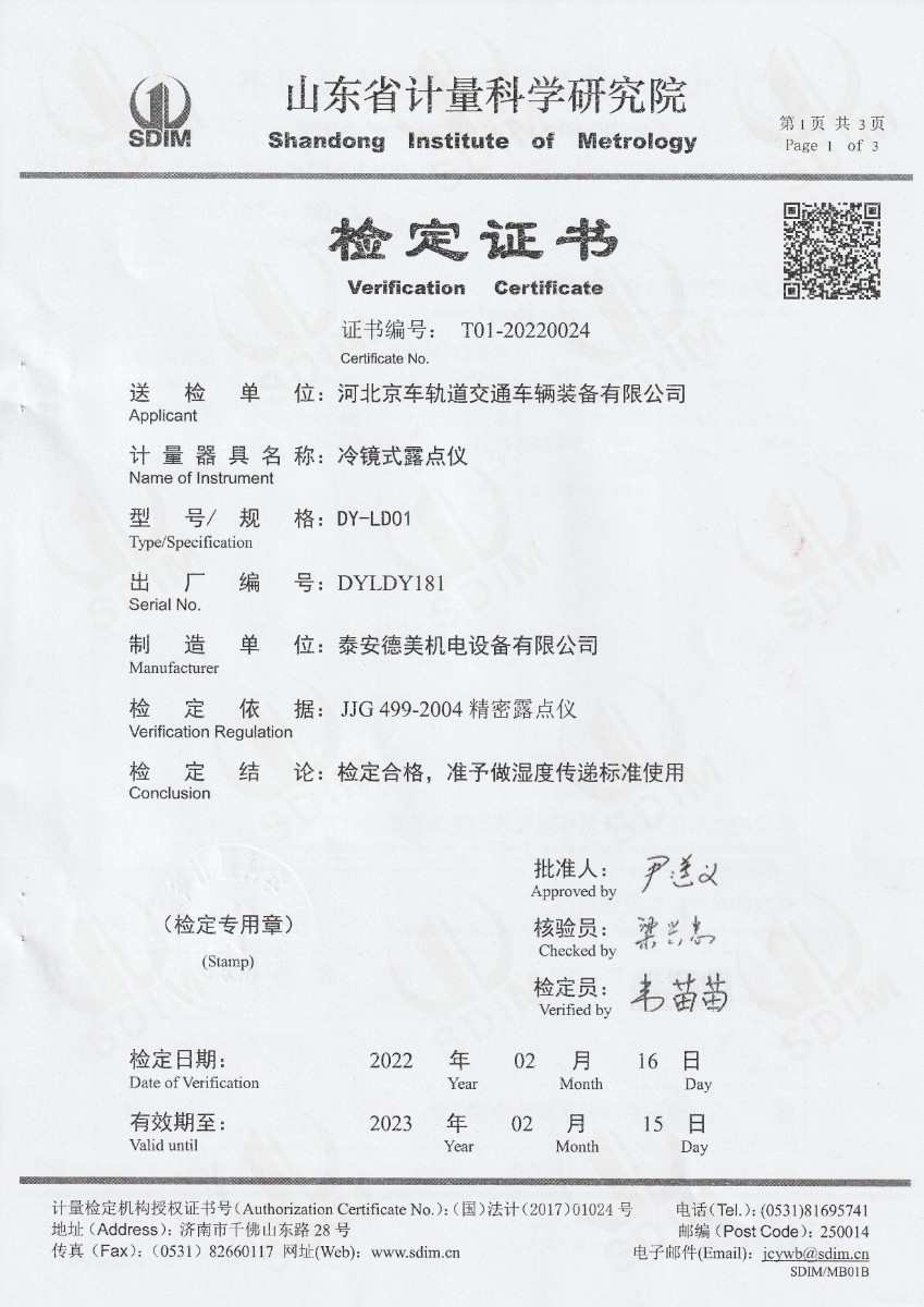 | 上一條:河北京車軌道交通車輛裝備有限公司-冷鏡式露點(diǎn)儀(溫度)校準(zhǔn)證書 | 下一條:便攜式干體爐(-30-150℃)校準(zhǔn)證書 |