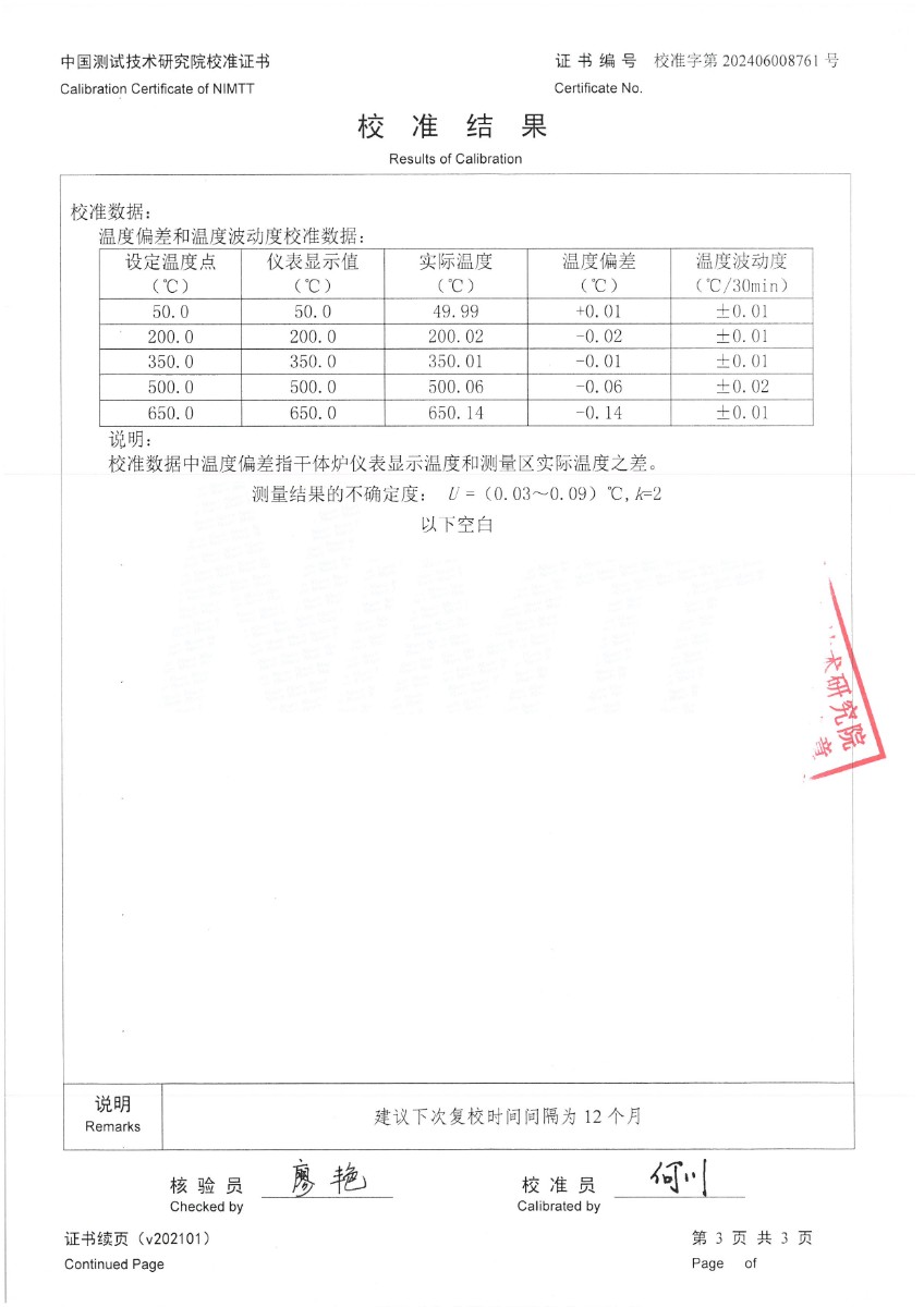 中溫干體爐295(50~650℃)校準證書 2024-7-6 本文被閱讀 6201 次