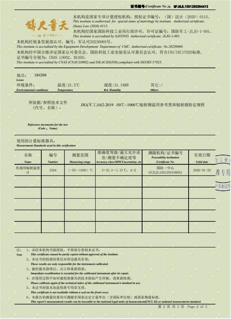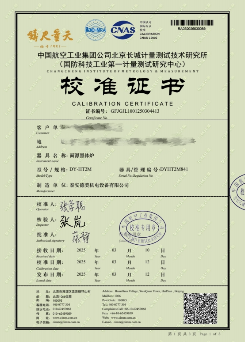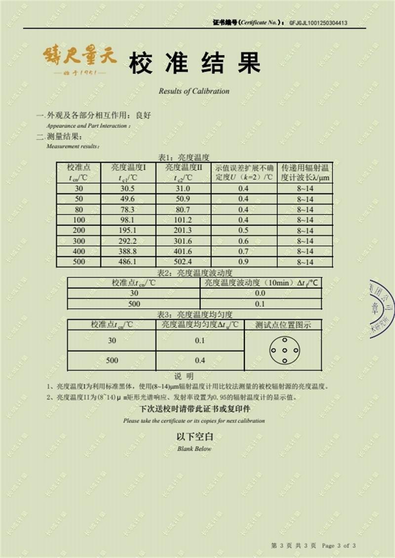 | 上一條:貴金屬熱電偶檢定爐(300-1200℃)校準(zhǔn)證書 | 下一條:超低溫面源黑體爐(-40-80℃)校準(zhǔn)證書 |