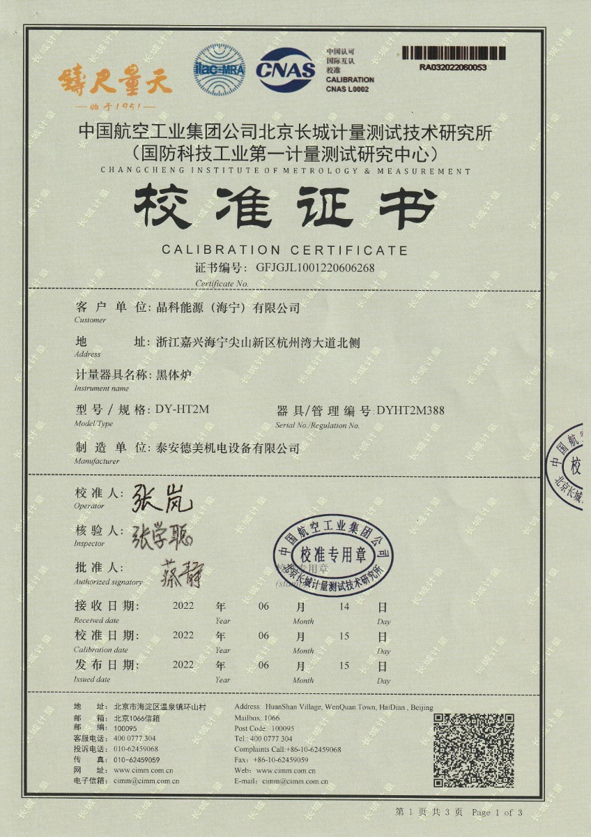 晶科能源(海寧)有限公司-黑體爐 2022-7-5 本文被閱讀 13991 次