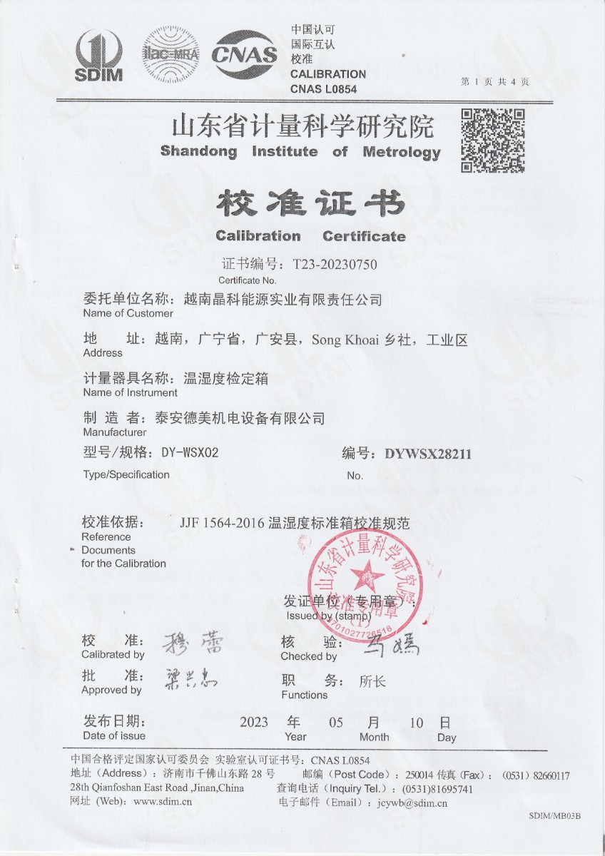 越南晶科能源實業(yè)有限責任公司 溫濕度標準箱 校準證書 2023-6-1 本文被閱讀 12013 次