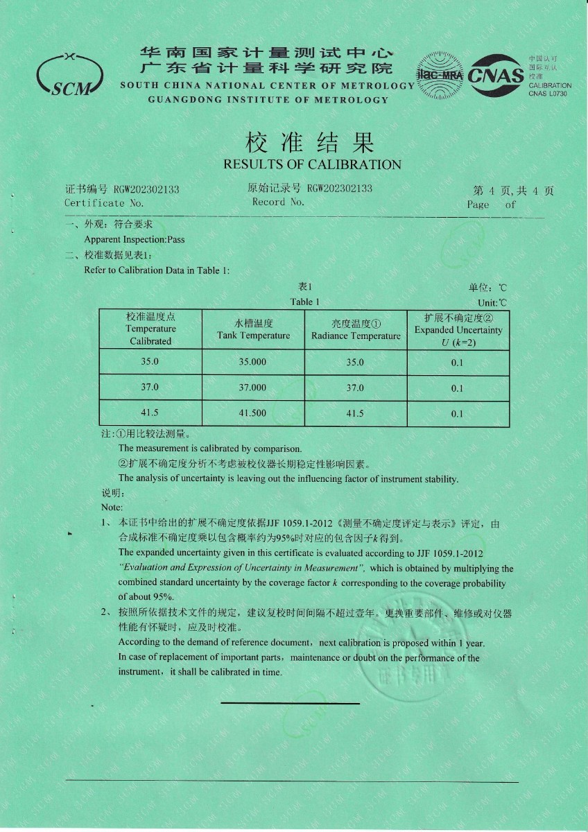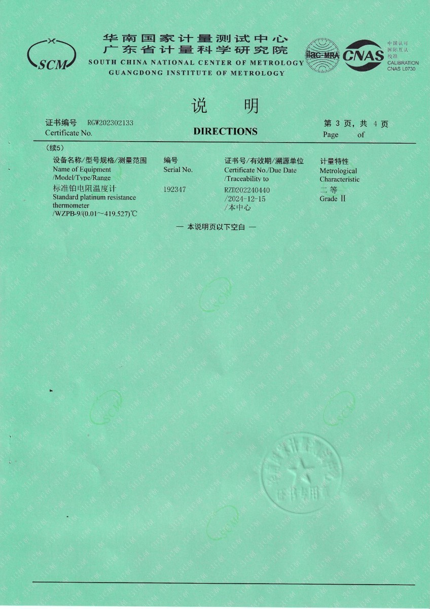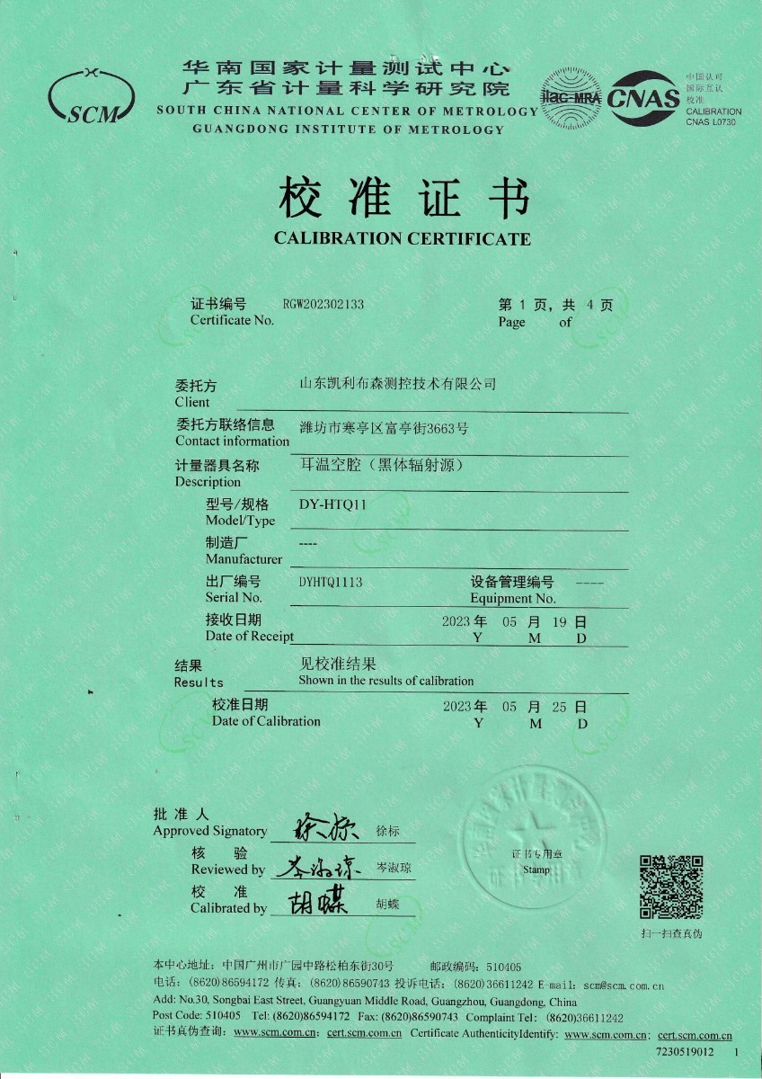 | 上一條:山東凱利布森測控技術(shù)有限公司 額溫空腔(黑體輻射源) 校準證書 | 下一條:便攜式干體爐(-30-150℃)校準證書 |