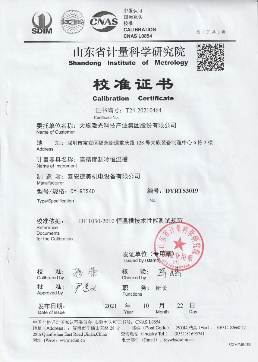 大族激光科技產(chǎn)業(yè)集團股份有限公司-高精度制冷恒溫油槽校準證書