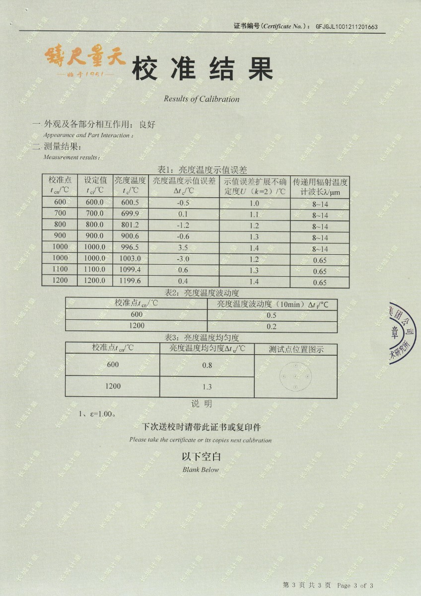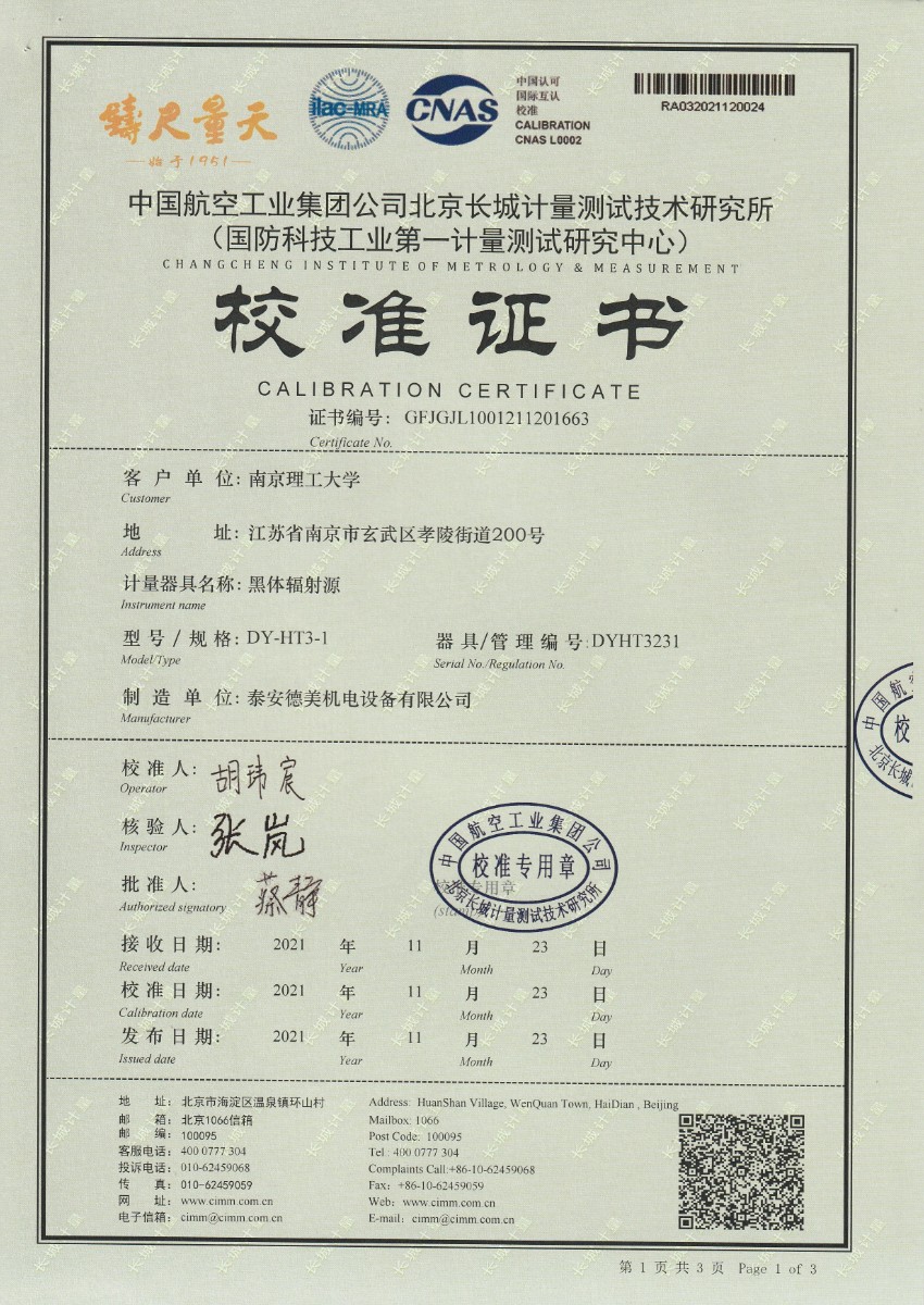 | 上一條:南京理工大學-黑體輻射源校準證書350-800℃ | 下一條:便攜式溫濕度檢定箱(-10-60℃)校準證書 |