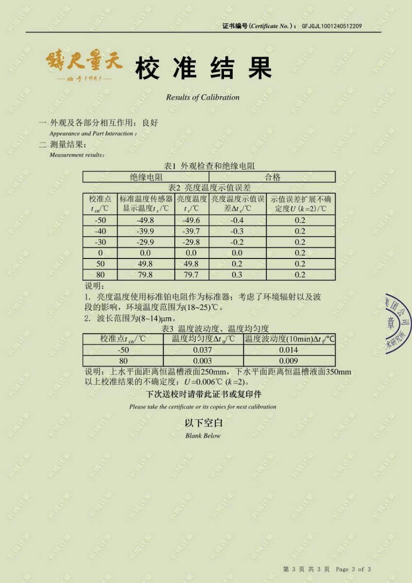 上一條:高精度低溫黑體241校準(zhǔn)證書下一條:超低溫面源黑體爐(-40-80℃)校準(zhǔn)證書