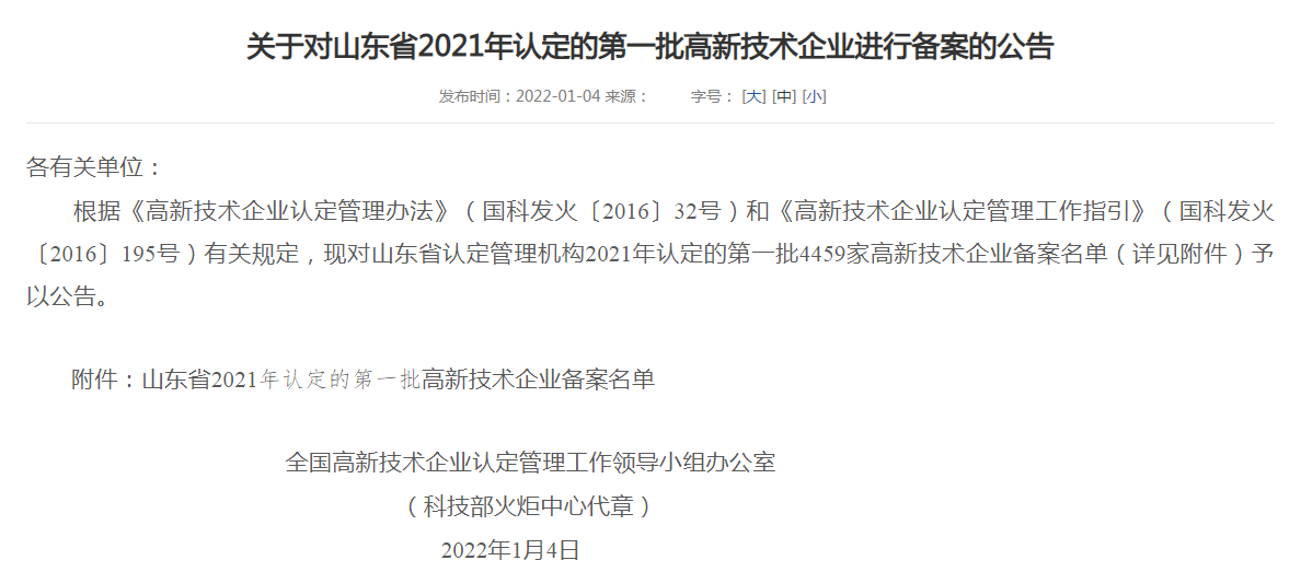 近日,山東省高企業(yè)認定管理工作網(wǎng)公布了《關于對山東省2021年認定的diyi批企業(yè)進行備案公示的通知》,