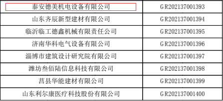 泰安德美機電設備有限公司成功入選“山東省2021年認定的diyi批企業(yè)”。