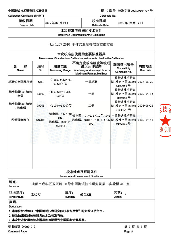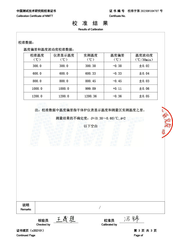 | 上一條:黑體輻射源(50-1200℃)校準(zhǔn)證書 | 下一條:便攜式干體爐(-30-150℃)校準(zhǔn)證書 |