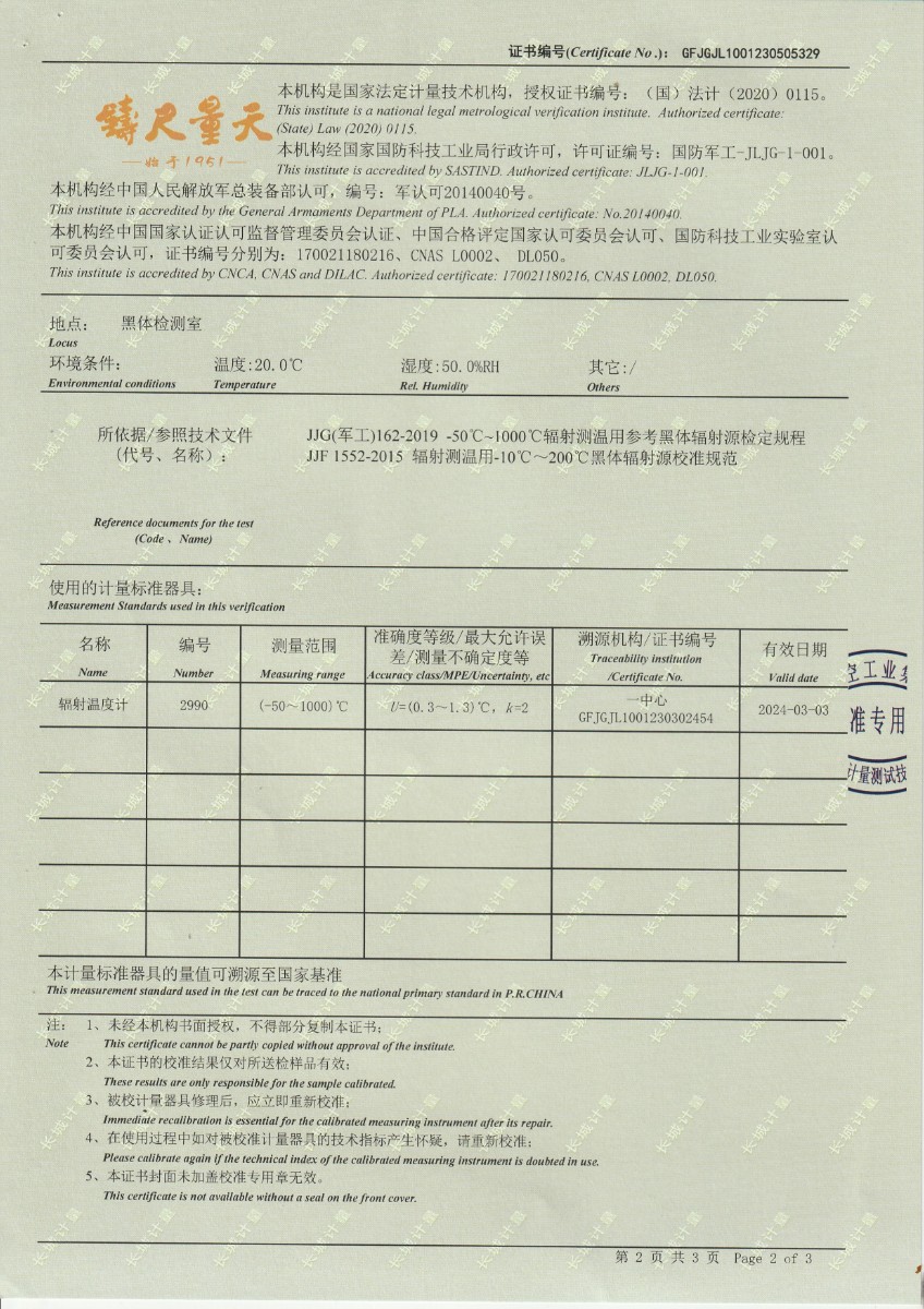 | 上一條:淮安捷泰新能源科技有限公司 黑體輻射源 校準(zhǔn)證書 | 下一條:溫濕度檢定箱(-5~65℃)校準(zhǔn)證書 |